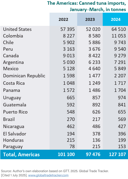Los países no productores (principalmente Estados Unidos, el Reino Unido de Gran Bretaña e Irlanda del Norte, Australia y Canadá) fueron los principales importadores de productos finales en el primer trimestre de 2025. En la Unión Europea, se absorbieron cantidades significativas de productos de atún listos para consumir, principalmente a través del comercio intra-UE. Las importaciones también aumentaron en los mercados de América Latina de Colombia, Chile, Perú y Argentina a favor de Ecuador, el principal exportador a esta región.