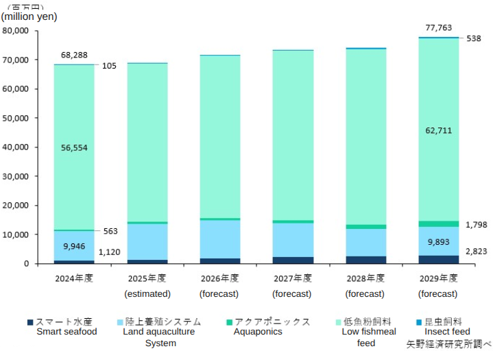 Insect Feed: The smallest but rapidly expanding sector, valued at ¥105 million (about $0.7 million) in FY2024, is expected to increase more than fivefold to ¥538 million (about $3.6 million) by FY2029, largely due to its high-value-added properties that are believed to improve seafood immunity.