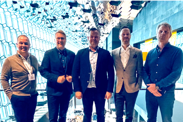 At Aqua-Ice: Stian Paulsen, Commercial Director Sea Based at AKVA group; Daniel Jakobsson, CEO at Arctic Fish; Egill Olafsson, Operational Manager at Arctic Fish; Benedikt Ernir Stefánsson, Sales and Procurement Manager at Egersund Island / AKVA group; and John Gunnar Grindskar, COO Farming at Arctic Fish. Photo: AKVA group.