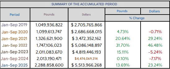 According to the latest available figures, in the first 9 months of 2025, Ecuador exported approximately 1.038 million tons of shrimp, achieving a turnover of more than 5.5 billion USD. This represents a significant increase of 14% in volume and 23% in value compared to the same period in 2024.