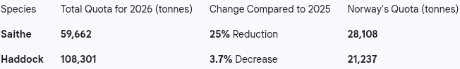 • A total quota of 14,034 tonnes has been agreed upon for all areas, representing a drastic 44% reduction compared to the 2025 quota.