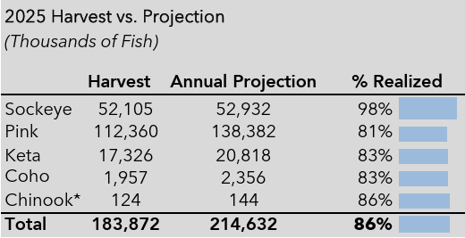 - Sockeye: La cosecha de salmón sockeye, una especie clave para las pesquerías de la Bahía de Bristol y el Río Copper, ha alcanzado el 98% de su proyección anual.