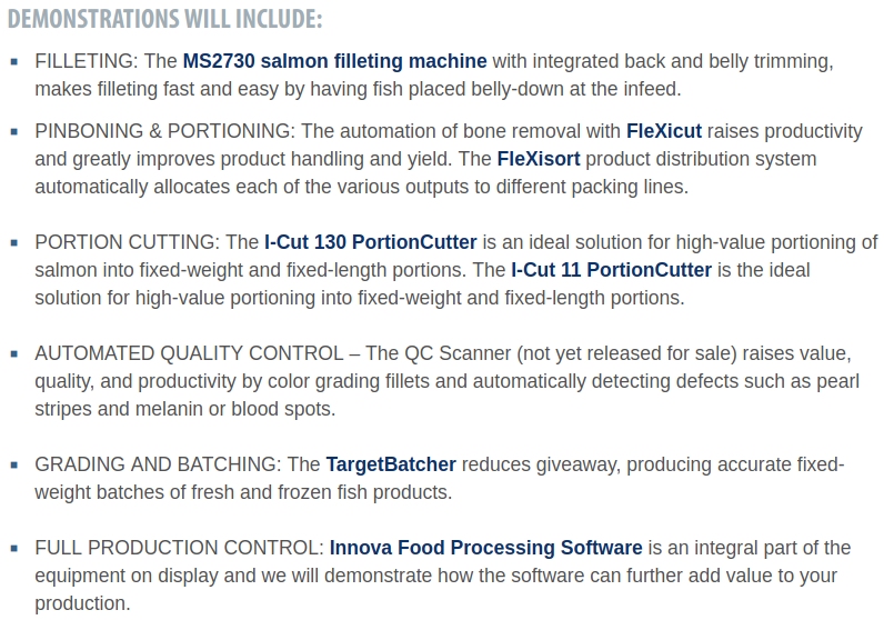 Other highlights this year include batching of frozen portions, automatic pinboning and portioning for whitefish, and food processing software that enables full production control.