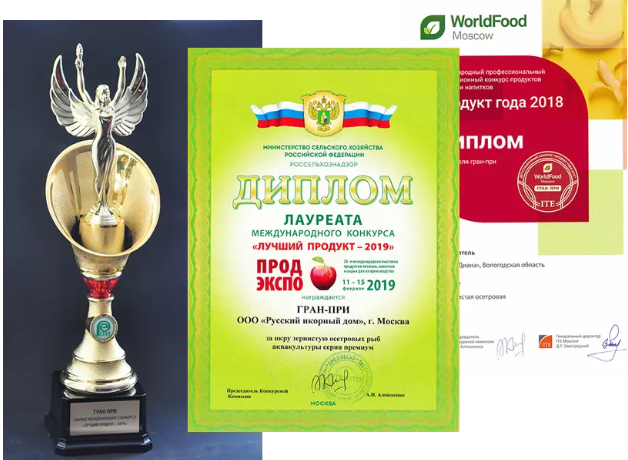 “Russian Caviar House” is the most titled producer of black sturgeon caviar in Russia. Since 2009, the company’s products have annually won grand prix and gold medals at competitions within the framework of industry exhibitions WorldFood and ProdExpo. The company was included in the list of symbols of Russia according to the Icons of Russia publication.
