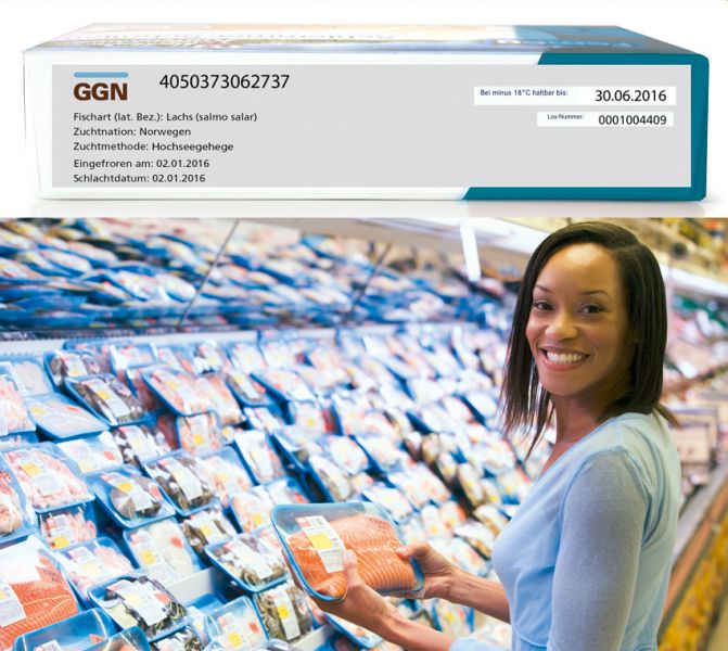 Todos los productos de acuicultura con la etiqueta GGN están certificados de acuerdo con las normas de los estándares de acuicultura GLOBALG.A.P. GGN significa un número de identificación de trece cifras por el cual todos los participantes certificados en la cadena de producción y suministro pueden ser reconocidos (ventana emergente: la abreviatura GGN significa 'número GLOBALG.A.P.').