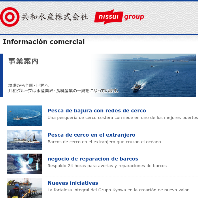 Desde su fundación en 1947, el Grupo Kyowa Suisan se ha dedicado al negocio de productos del mar no sólo en Japón sino también en los océanos del mundo. Actualmente, tres empresas del grupo operan negocios de cerco costero, negocios de cerco en el extranjero, negocios mayoristas de pescado fresco y negocios de reparación de barcos.