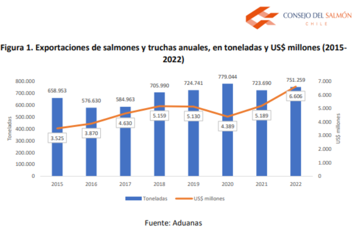 El reporte muestra que las exportaciones de salmones y truchas alcanzaron un total de 751.259 toneladas durante 2022, lo que corresponde a un incremento del 3,8% respecto de 2021. Mientras que al observar el periodo 2015- 2022, indica que la variación anual de las toneladas exportadas promedió un 2,6%, en tanto las cosechas anuales crecieron, en promedio, a un ritmo de 1,3% anual en dicho periodo, según datos del Servicio Nacional de Pesca y Acuicultura (Sernapesca).
