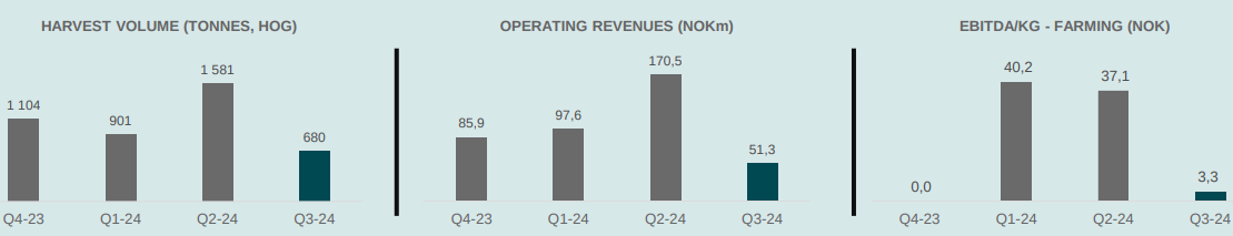 - Group EBITDA of -7.3 NOKm - Farming EBITDA of 2.2 NOKm and NOK 3.3 EBITDA/kg