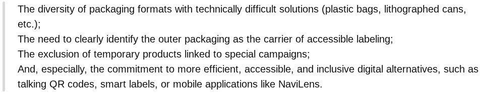 The association also warns that the draft "breaks the community regulatory framework" and the principle of mutual recognition, by requiring imported products from other EU countries to comply with these specific Braille labeling obligations. This could violate Regulation (EU) 2019/515 on the mutual recognition of goods lawfully marketed in another Member State.