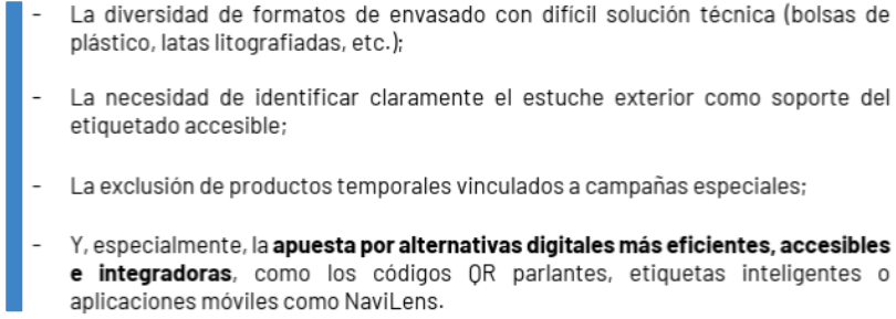 Desde un inicio, ANFACO-CECOPESCA ha mostrado su compromiso con la accesibilidad, proponiendo soluciones adaptadas a la complejidad de envases como latas y bolsas. La organización ha abogado por alternativas digitales más eficientes y sostenibles, como códigos QR parlantes o aplicaciones móviles (ej. NaviLens), argumentando que solo el 10% de las personas ciegas en España usan braille habitualmente.