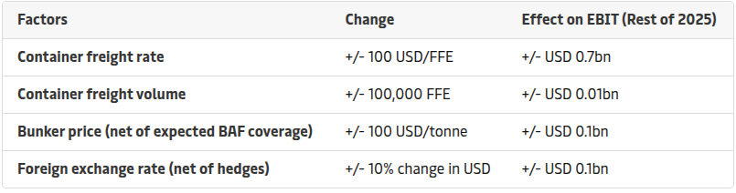 El rendimiento financiero de Maersk para 2025 depende de varios factores sujetos a incertidumbres relacionadas con las condiciones macroeconómicas, los precios del combustible búnker y las tarifas de flete. En igualdad de condiciones, a continuación se detallan las sensibilidades para 2025 según cuatro supuestos clave.