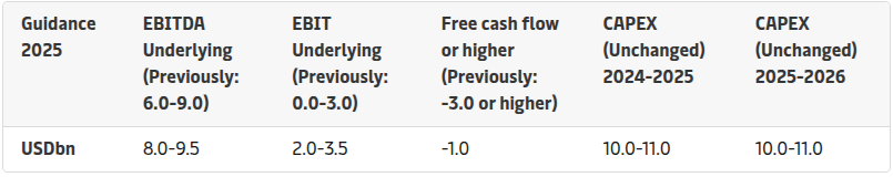 Dada la mayor resiliencia de la demanda del mercado fuera de Norteamérica, Maersk eleva sus previsiones financieras para 2025, según la tabla a continuación. El crecimiento previsto del volumen del mercado global de contenedores se ha revisado a entre el 2 % y el 4 % (anteriormente entre el -1 % y el 4 %). Actualmente, se espera que la disrupción en el Mar Rojo se prolongue durante todo el año.