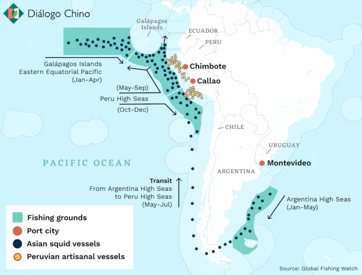 On the left of the image, over the Pacific Ocean, you can see the location of the Chinese jigger fleet that targets giant squid between May and December. Source: Dialogo Chino
