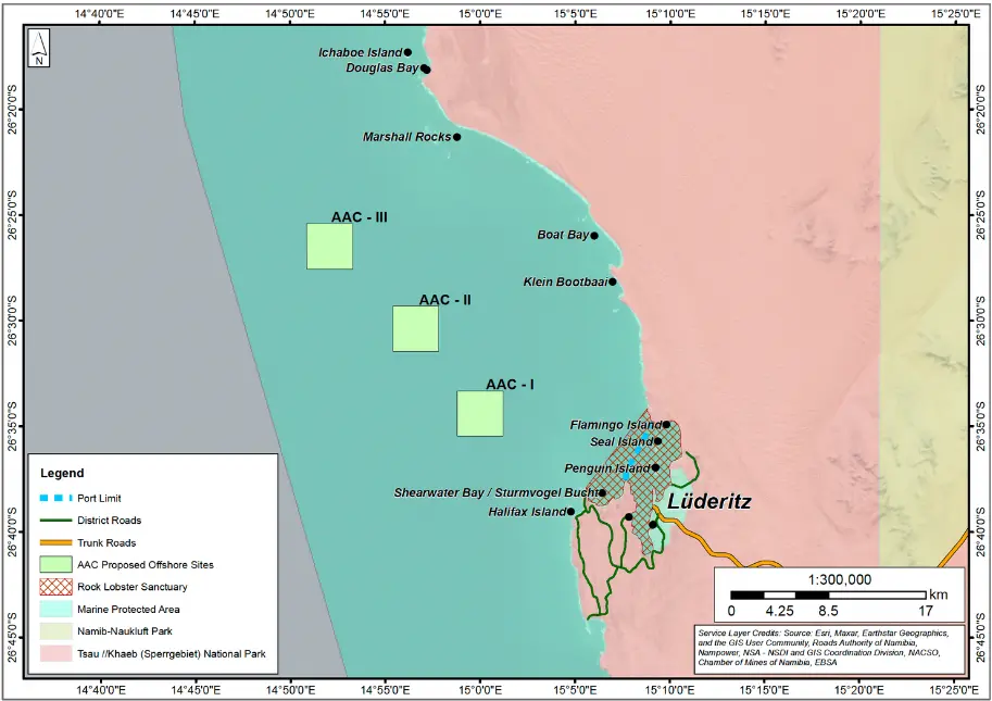 Three sea sites outside Lüderitz: African Aquaculture has been granted licences totalling 51,000 tonnes of salmon. Photo: African Aquaculture. Click on the image to enlarge it