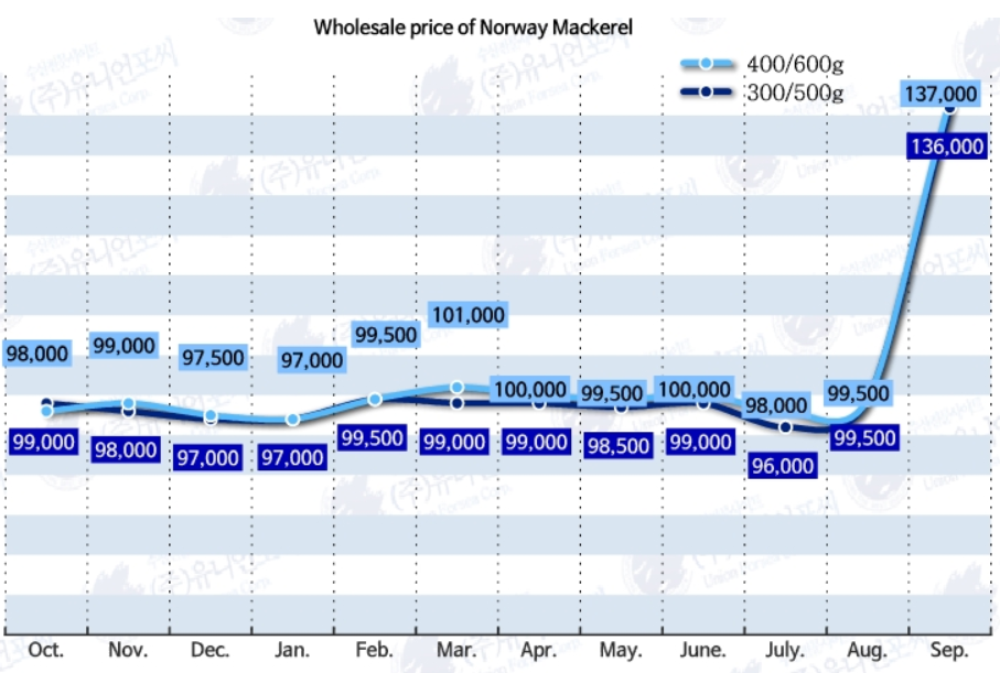 SEOUL — A paradoxical trend is gripping the South Korean seafood market. Despite record-breaking import volumes, the wholesale price of Norwegian frozen mackerel has surged dramatically. By the second week of September 2025, prices had risen by nearly 40% compared to the previous month, putting pressure on both distributors and consumers of this staple product.