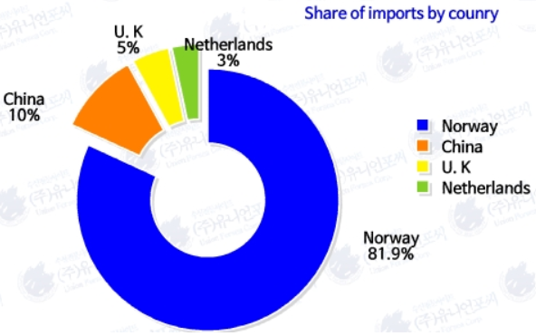 While Norway dominates the market, other nations are also key suppliers. Following Norway, China was the second-largest exporter with 3,913 tons (9.78%), at a lower average unit price of $1.87/kg. The UK and the Netherlands also contributed to the supply, providing 1,772 tons and 1,294 tons, respectively.