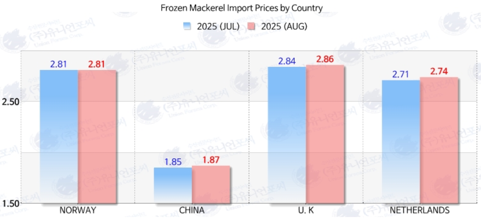 According to data from Union Forsea Corp., South Korea imported 40,010 tons of frozen mackerel by the end of August 2025, a sharp 56.1% increase from 25,638 tons during the same period in 2024. Norway was the overwhelming market leader, supplying 31,554 tons, which accounts for 78.87% of all imports. The average import unit price from Norway stood at $2.81/kg, underscoring its premium market position.