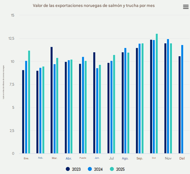 Noruega exportó 126.191 toneladas de salmón en noviembre, valoradas en aproximadamente US$ 1.13 mil millones (11.4 mil millones NOK). Esto representó una caída del 4 por ciento en el valor, una disminución de alrededor de  US$ 46.8 millones (472 millones NOK), en comparación con noviembre del año anterior. El volumen de exportación también experimentó una disminución del 3 por ciento.
