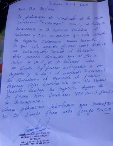 Dirigentes de Ecocéanos denuncian que la salmonera habría ofrecido 400.000 pesos chilenos a los pescadores para que mientan. (Foto: Ecocéanos)