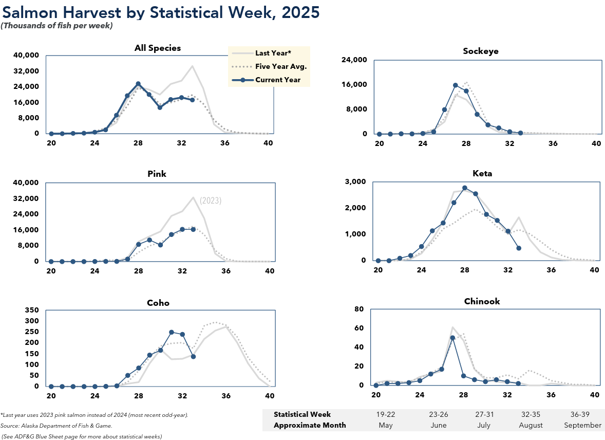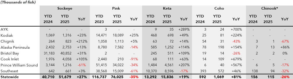 Note: YTD comparisons are based on statistical weeks. Statistical weeks between years do not align with calendar dates. Data are subject to revision. Prior YTD harvest volume has been updated to reflect 2024 in-season harvest reporting as compiled by McKinley Research Group. Source: Alaska Department of Fish & Game . *Chinook figures exclude harvest before week 20