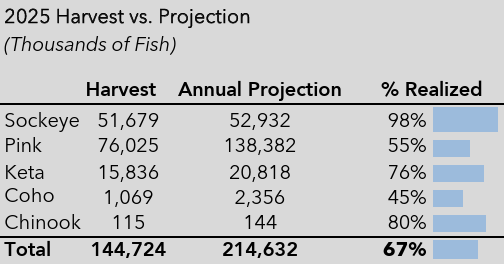 Keta Salmon: The statewide keta harvest is up 19% from 2024. A notable 207% increase in the Prince William Sound harvest is helping to offset a 17% decline in the Southeast harvest.