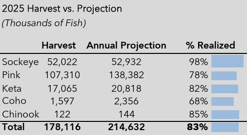 While most species have performed well, the keta salmon harvest in Southeast Alaska has declined by 22% compared to 2024, which is a concern for the region. However, a significant 207% year-over-year increase in keta harvest in Prince William Sound has helped to offset this regional drop, bringing the statewide keta harvest to 82% of its annual projection.