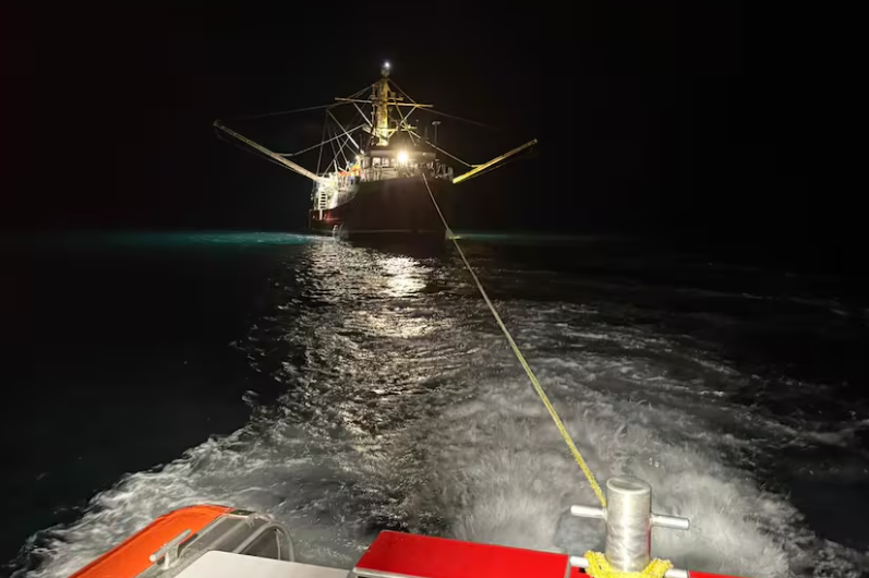 El patrón y el ingeniero del pesquero, junto con un voluntario de la Guardia Costera, fueron colocados de nuevo en el barco para prepararlo para el remolque. El Sealord Rescue remolcó con éxito el barco averiado hasta Croisilles Harbour para que los buzos evaluaran los daños.
