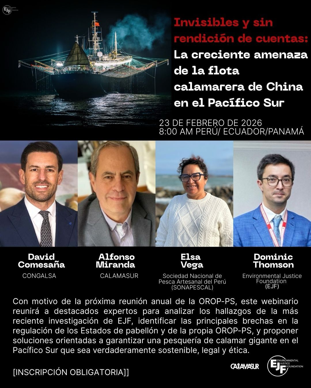 “Una de las pesquerías de calamar más importantes del mundo se está encaminando hacia una crisis ecológica y social a medida que vastas flotas pesqueras chinas se aprovechan de la débil gobernanza, la escasa transparencia y los vacíos regulatorios en todo el Pacífico Sudeste”. A esta crisis biológica, una nueva investigación de Environmental Justice Foundation (EJF) añade los abusos laborales de la una de las empresas implicadas –China National Fisheries Corporation– cuyas capturas se exportan a EE. UU., la Unión Europea y el Reino Unido.