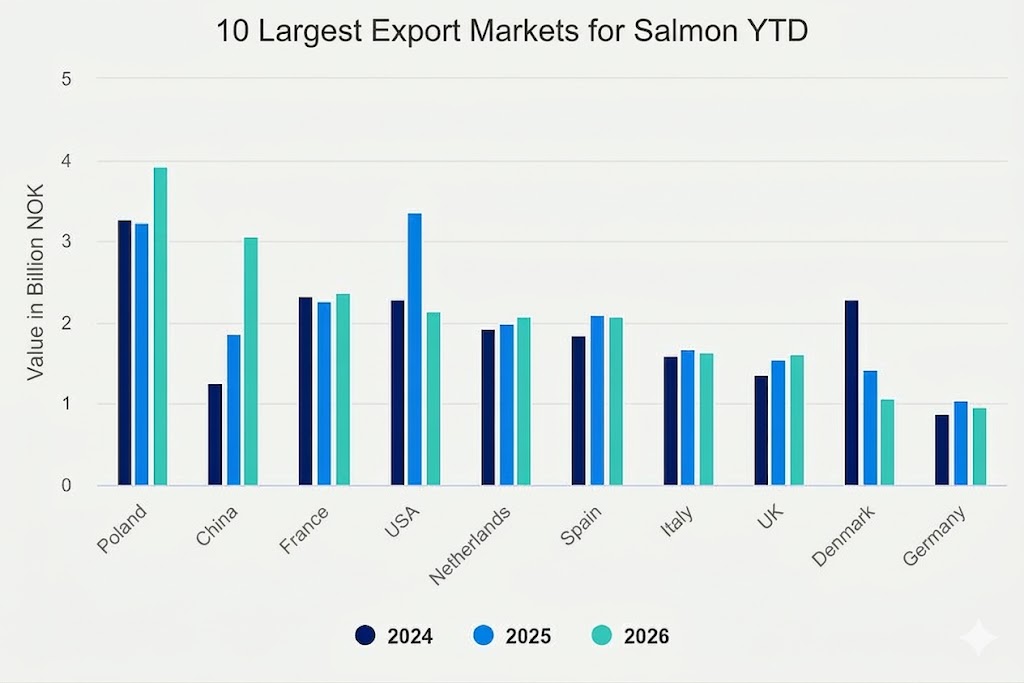 Despite this, China emerged as the standout growth market in March, with export values rising by US$52.4 million (NOK 552 million)—a sharp 68% increase year-on-year. Total exports to China reached approximately US$133 million (NOK 1.4 billion).
