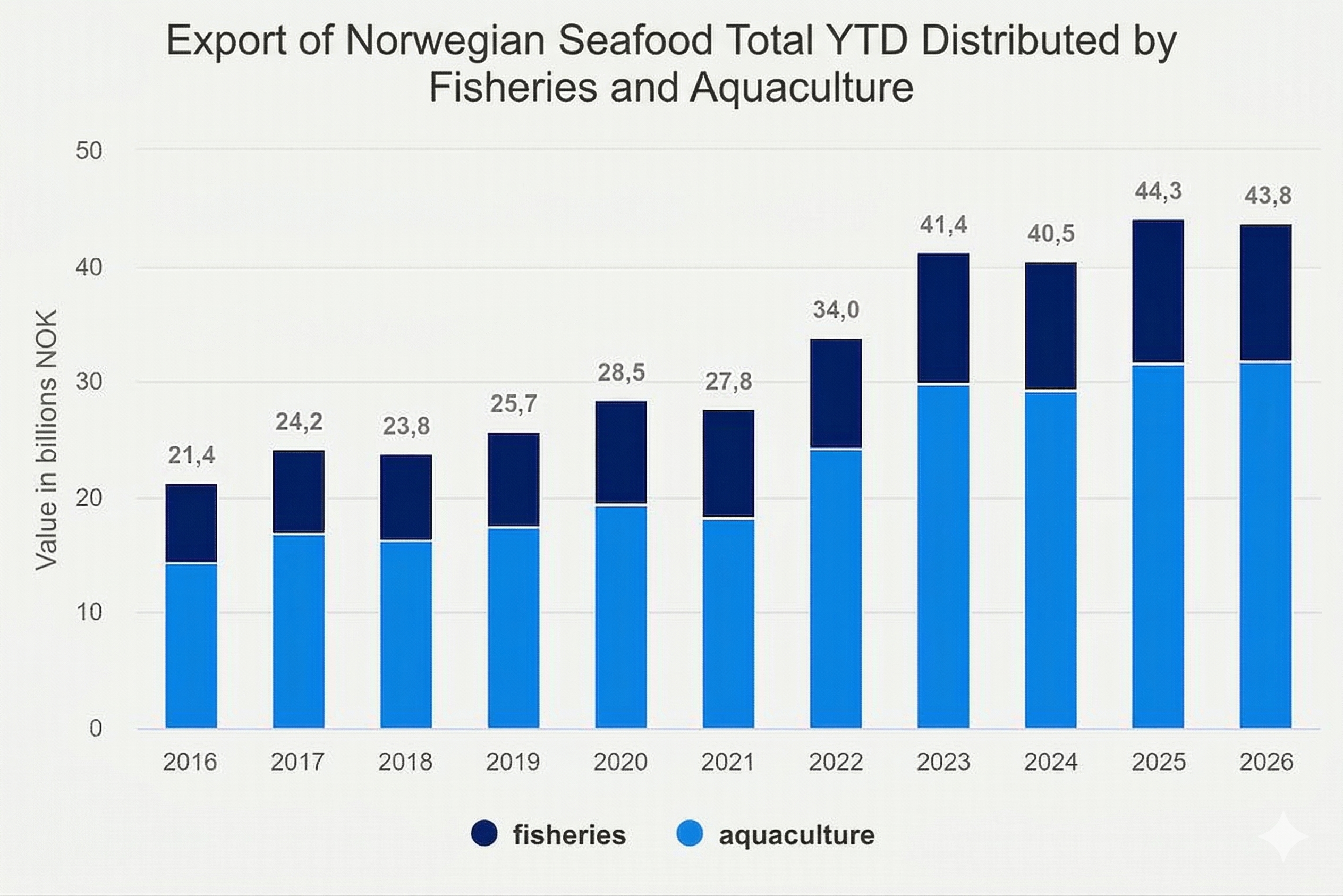 ノルウェーの水産業は3月に回復力を示し、輸出額は約US$1.47 billion(NOK 15.5 billion)に達した。これは前年同月比で約US$49.6 million(NOK 522 million)、**3%**の増加となる。