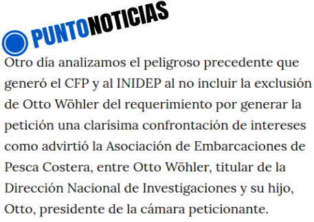 In previous articles we had referred to “conflicts of interest” and, as expected, journalist Garrone presents in his article a model of conflict: “CEPA’s request to fish squid north of 41°S as a target species,” and the journalist says: “The other day we analyzed the dangerous precedent generated by the Federal Fisheries Council and INIDEP by not excluding Otto Wöhler from the request, since the petition clearly generated a confrontation of interests as warned by the Coastal Fishing Vessel Association, between Otto Wöhler, head of the National Directorate of Research, and his son, Otto, president of the petitioning chamber.”