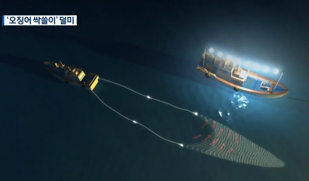 La televisión coreana explica cómo los barcos de arrastre roban las concentraciones de calamares atraídas por los barcos poteros.