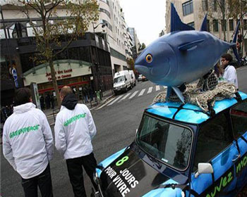 Greenpeace activists hung a banner outside the ICCAT conference venue that read “Bluefin Tuna: 8 Days to Live” and also brought a car with a bluefin tuna on top of it to the venue’s main entrance.