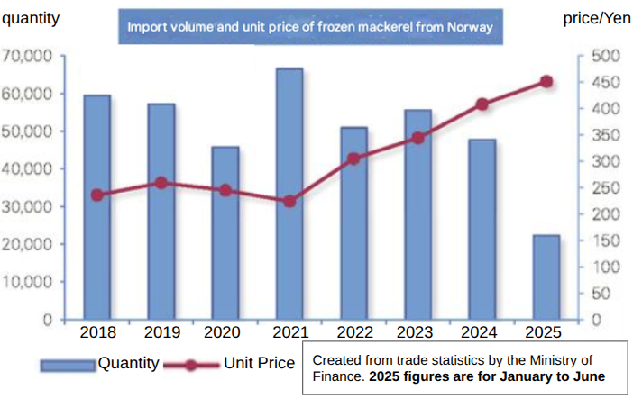 TOKYO—A perfect storm of factors has driven the price of Norwegian mackerel to unprecedented levels, causing shockwaves through Japan's seafood industry. According to reports from Minato Yamaguchi, traders are now facing record-high import costs, with prices reaching 650-640 yen per kilo (C&F, shipping included), a staggering 50% increase from the same period last year.