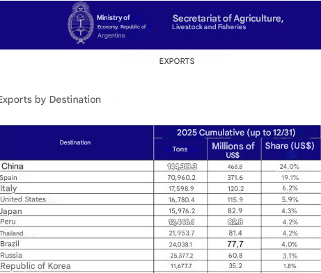 在一个重要变化中,中国在2025年取代西班牙,成为阿根廷水产品的最大出口目的地。