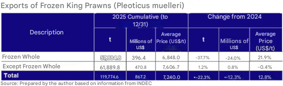 Exports of Pleoticus muelleri shrimp totaled 119,774 tons, representing a 22.3% decline in volume. Shrimp sales generated $867.2 million, down 12.3% compared to prior years. Specifically, whole shrimp exports fell 37.7% in volume and 24.0% in value, marking a drop of more than $125 million from 2024.
