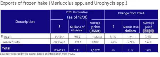 Exports of Argentine hake (Merluccius hubbsi) remained relatively stable. In 2025, 123,409 tons were exported, a 1.1% increase from 2024. In value terms, hake exports generated $313 million, up 2.1% year-over-year.