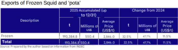 The standout performer in 2025 was Illex squid, boosted by an excellent fishing season. Argentina exported 193,385 tons of frozen squid and jumbo squid, a 32.5% increase compared to 2024. In value terms, squid exports reached $550 million, up 47.7% year-over-year, with CAPeCA estimating an additional $178 million compared to 2024.