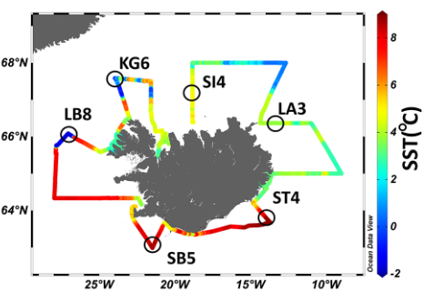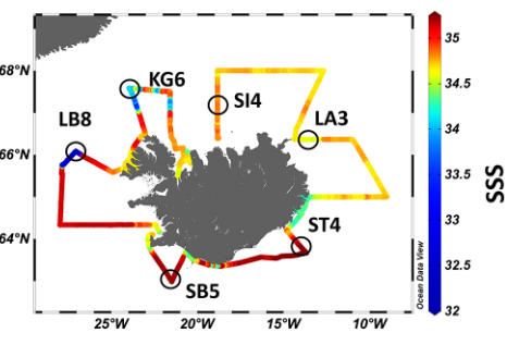 El monitoreo oceánico desde 1970 muestra una tendencia general de calentamiento en las aguas que rodean Islandia. Las mediciones recientes también sugieren una recuperación del Agua Atlántica después de una anomalía a gran escala fría y de baja salinidad al sur de Islandia que comenzó en 2017.