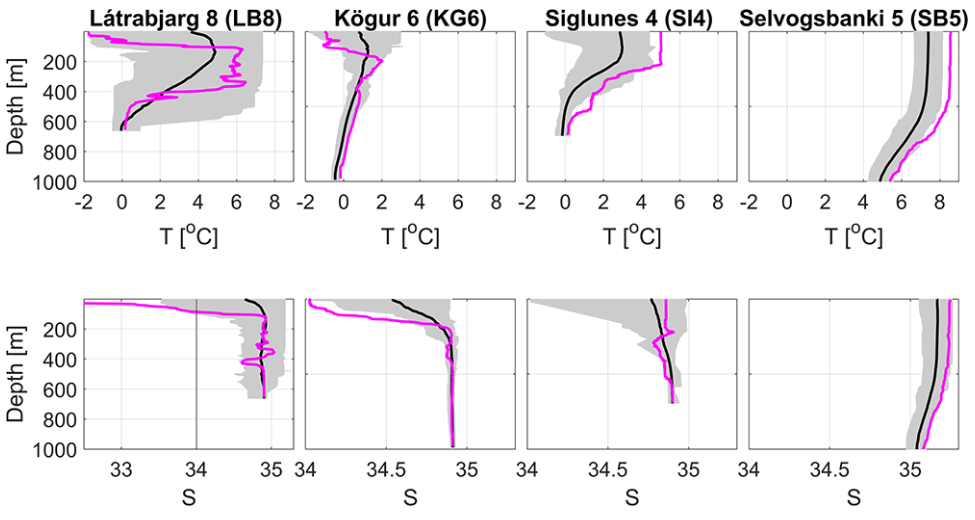 Perfiles de temperatura (panel superior) y salinidad (panel inferior) en cuatro estaciones diferentes, recopilados durante la expedición de febrero de 2026 (magenta), comparados con los perfiles medios invernales a largo plazo (negro). El sombreado gris indica el rango histórico de los valores invernales observados entre 1970 y 2025. Nótese que la temperatura en Siglunes 4 y Selvogsbanki 5 es más alta que nunca, mientras que en Látrabjarg 8 y Kögur 6, el agua cerca de la superficie es extremadamente fría y dulce. Nótese la diferente escala de salinidad en LB8. Fuente: Hafrannsóknastofnun Haga clic sobre la imagen para ampliarla