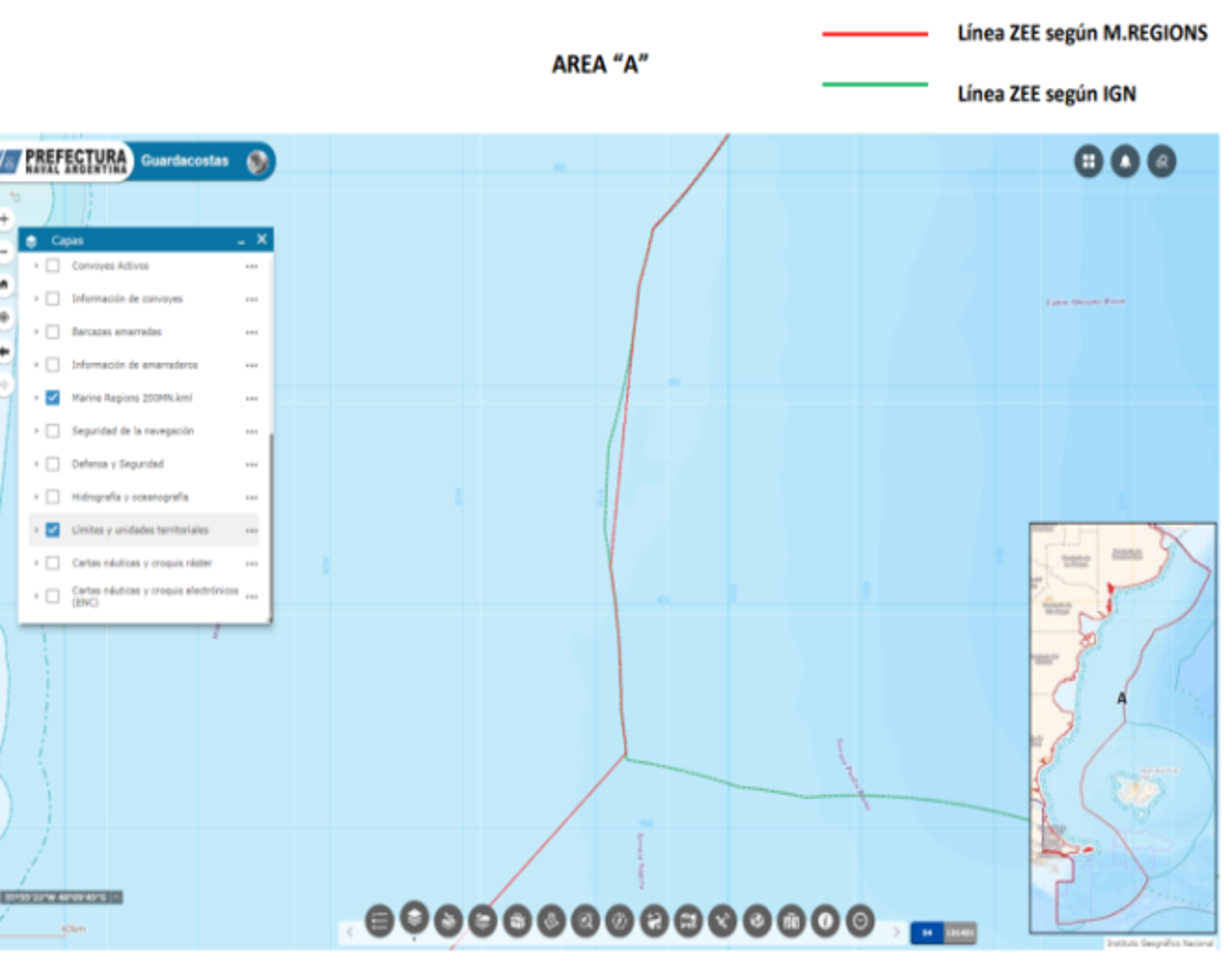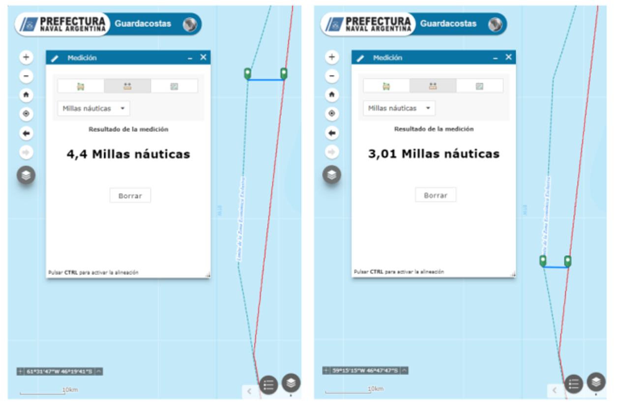 Induce a errores graves dar por sentados los límites que las plataformas de monitoreo presentan para los espacios marítimos de los Estados ribereños sin verificar que éstos se correspondan con los oficiales. La experiencia comparativa para varias Zonas Económicas Exclusivas de América del Sur demuestra que los límites que emplean algunas de estas plataformas presentan divergencias respecto de los oficiales, lo que con frecuencia hace ver como maniobras de pesca ilegal lo que en realidad ocurre fuera de las aguas jurisdiccionales. Esto sucedió durante años con los límites que emplea Global Fishing Watch para la ZEE de Argentina, extendiéndola en el área del Agujero Azul hasta 4,4 millas náuticas sobre alta mar. Esta divergencia existe también en el límite de la ZEE de Uruguay en su lateral con Brasil, sin corrección a la fecha.