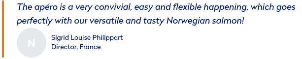 "The apéro is a very convivial, easy and flexible happening, which goes perfectly with our versatile and tasty Norwegian salmon!"