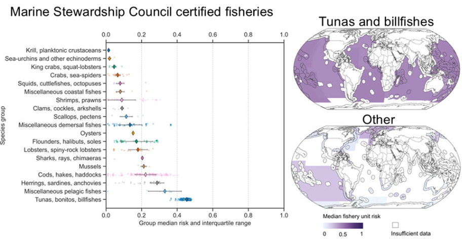 The study analyze a subset of global fisheries with high management performance (MSC-certified), suggesting risk may be higher among non-MSC-certified fisheries. Click on the image to enlarge it
