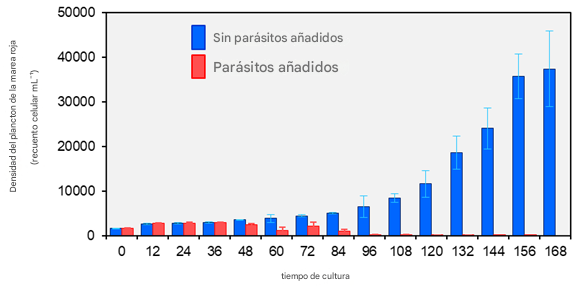 El eje izquierdo muestra la densidad celular del plancton de la marea roja, y el eje horizontal, el paso del tiempo. El azul indica el crecimiento del plancton de la marea roja sin la adición de parásitos, y el rojo, el crecimiento con la adición de parásitos. Se puede observar que la adición de parásitos suprime significativamente el crecimiento del plancton de la marea roja.