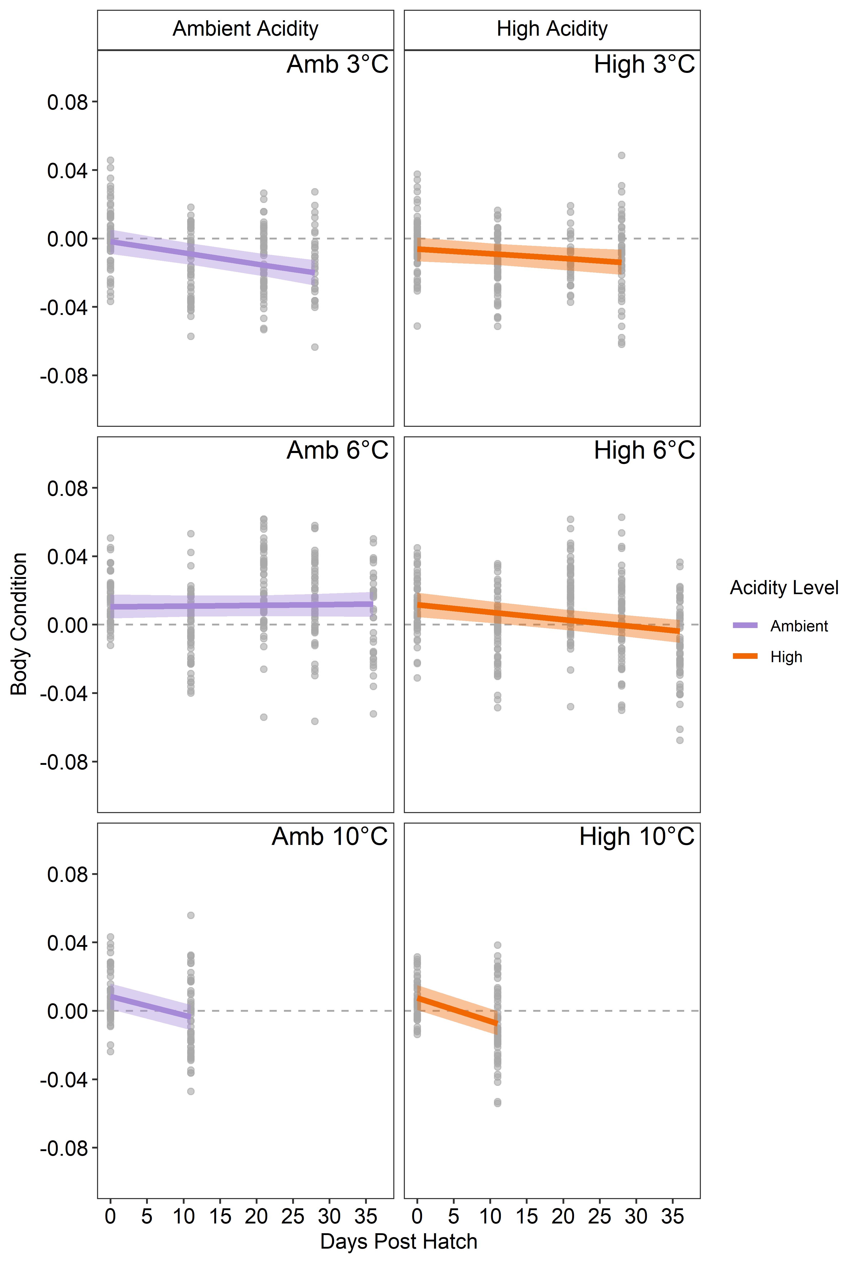 La condición corporal de las larvas a lo largo del tiempo bajo diferentes combinaciones de temperatura y acidez. Su condición disminuyó rápidamente en el tratamiento más cálido (10 °C), lo que provocó mortalidad y la finalización prematura del experimento. La acidificación afectó a las larvas solo a la temperatura óptima de 6 °C. Crédito: NOAA Fisheries