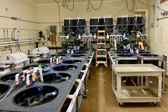 Laboratorio instalado para experimentos de acidificación y calentamiento oceánico con bacalao del Pacífico en sus primeras etapas. Grandes tanques en el fondo proporcionan agua de mar fría y a temperatura ambiente, mezcladas a temperatura ambiente. Pequeños tanques circulares albergan huevos y larvas a diferentes temperaturas y niveles de acidificación. La acidificación se controla mediante la burbujeación de dióxido de carbono en el agua de mar: una mayor cantidad de dióxido de carbono produce una mayor acidez (pH más bajo). Crédito: NOAA Fisheries/Emily Slesinger