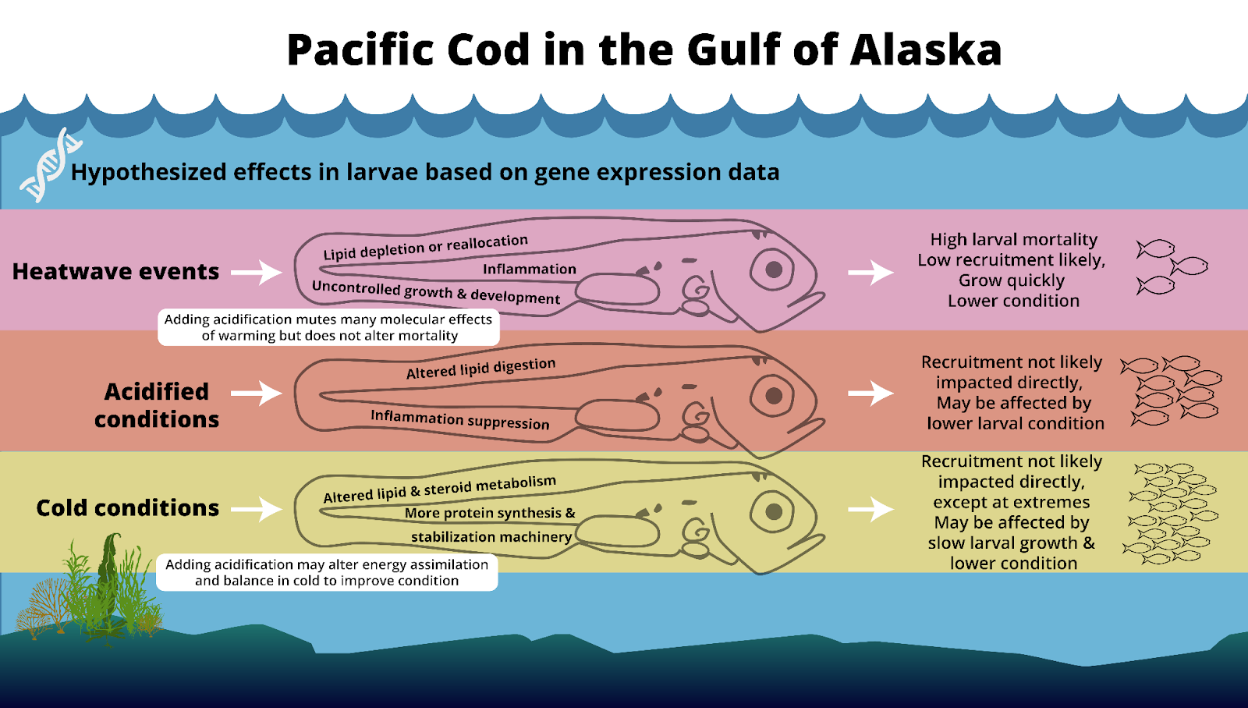 “Finding larvae that are dying in the field is very unlikely, but we were able to sample experimental larvae that we knew were dying rapidly due to warming,” said Emily Slesinger, researcher at NOAA’s Alaska Fisheries Science Center. They also sampled larvae exposed to other conditions. The experiments simulated more acidified water and colder temperatures which Pacific cod larvae currently experience in some regions and years. Slesinger continues, “The unique thing about this study’s approach is to look beyond whether these larvae live or die under different conditions, but to understand why through gene expression analysis.”