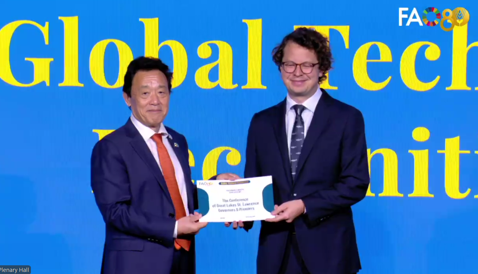 La iniciativa de 3 años, liderada por Great Lakes St. Lawrence Governors and Premiers (GSGP), recibió el premio “Blue Transformational Leader Award for Sustainable Aquatic Food Systems” (Líder de la Transformación Azul para Sistemas Alimentarios Acuáticos Sostenibles). John Schmidt, gerente de programa de GSGP, recibió el galardón en el marco del Foro Mundial de la Alimentación (WFF) 2025.