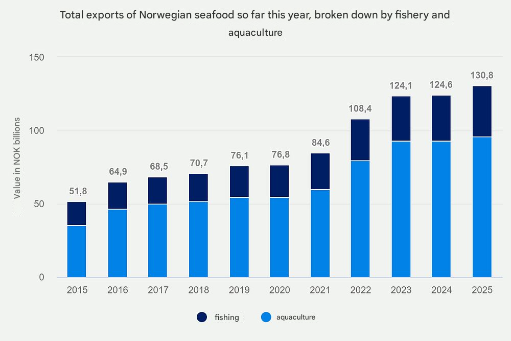 Year-to-date, Norway has exported seafood totaling 130.8 billion NOK (approximately $13.1 billion U.S. dollars), an increase of 5% compared to last year.