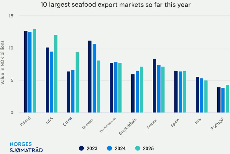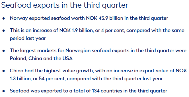 The strong performance in the third quarter confirms this trend. The total exported in the third quarter was 45.9 billion NOK (approximately $4.6 billion U.S. dollars), an increase of 1.9 billion NOK (4%) from the previous year. China recorded the highest quarterly value growth, an increase of 1.3 billion NOK, or 54%, compared to the third quarter last year.